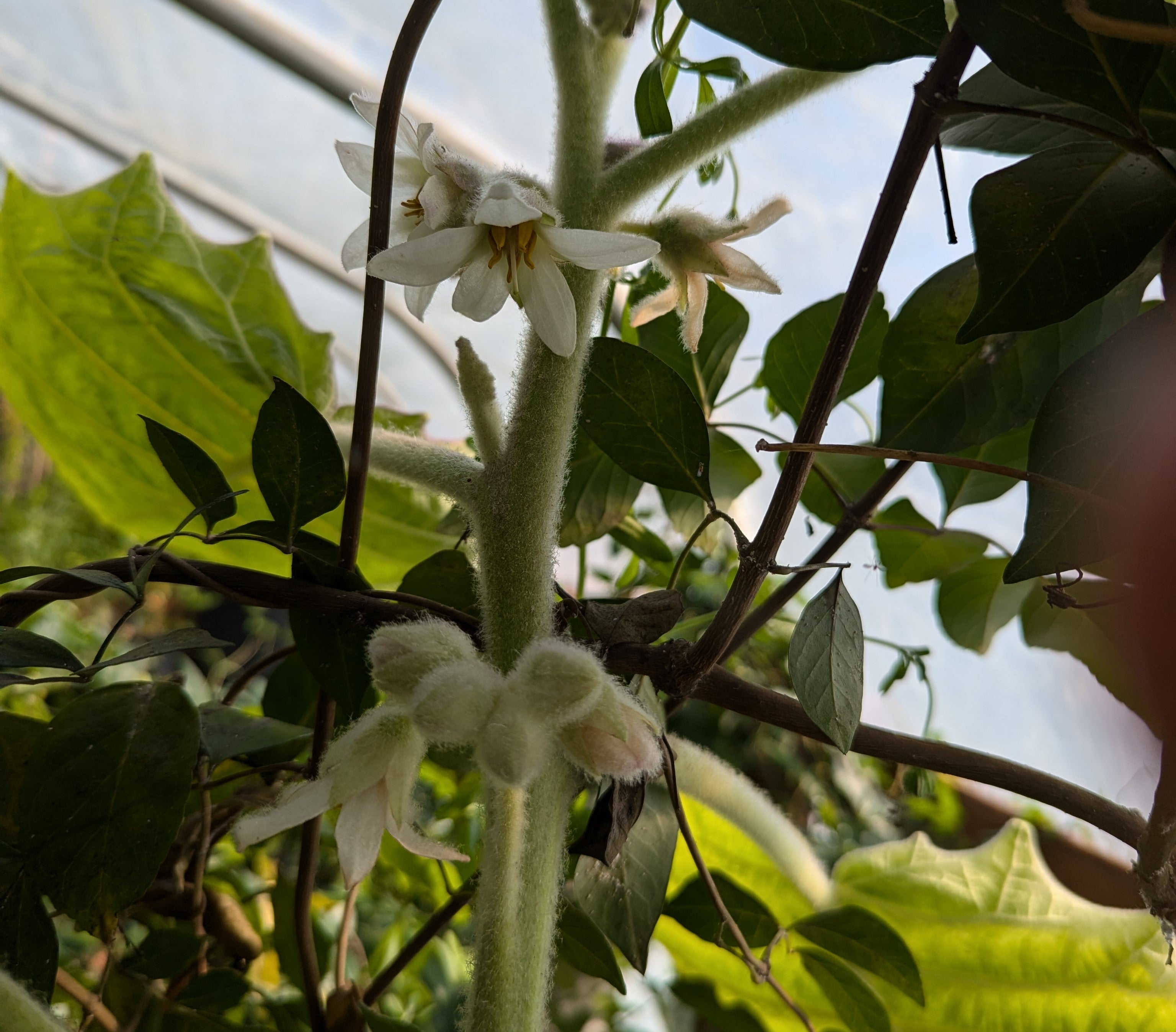 Lulo, Naranjilla. Mostly grown for its sweet, juicy fruits, this rare Solanum is also a very attractive plant.  The flowers are not particularly showy, but the leaves are covered with purple fur.  This is a thornless variety, so no dealing with all the prickles of the typical plant.  The fruit is prized in South America for eating fresh and making refreshing drinks.